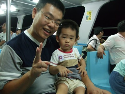大家一起坐在船的一角,搖搖晃晃的船,讓人很有坐船的感覺(廢話!),雖然夏夜高溫,風迎面吹來,很是舒爽(必須先忽略空氣中淡淡的臭味)。不過如果搖晃的時間再長一點的話,可能看往外面不是看景色,而是去排泄嘔吐物了。